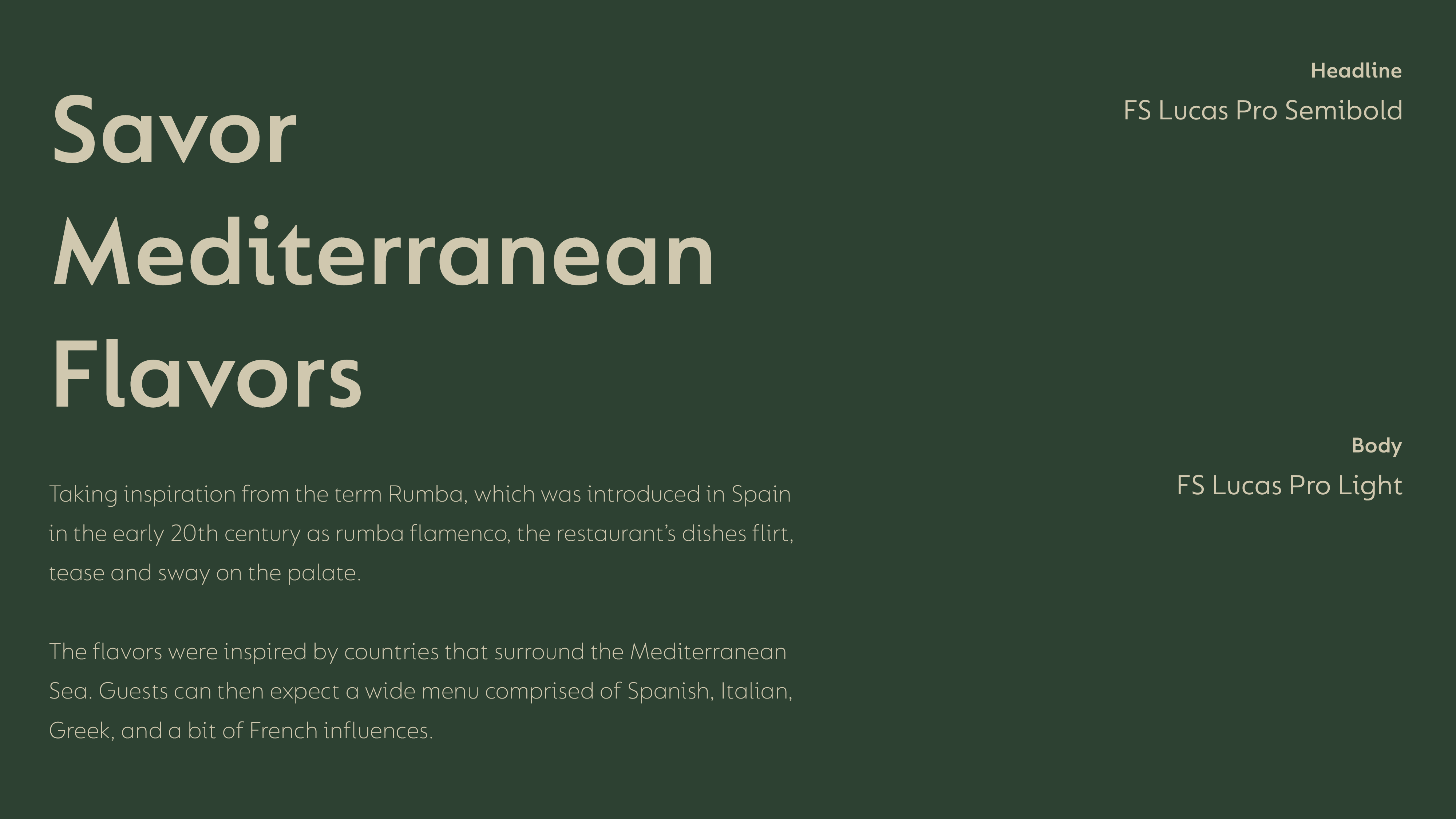 Rumba uses Felix Titling MT for display and for its logo while FS Lucas Pro for body texts and some headlines.