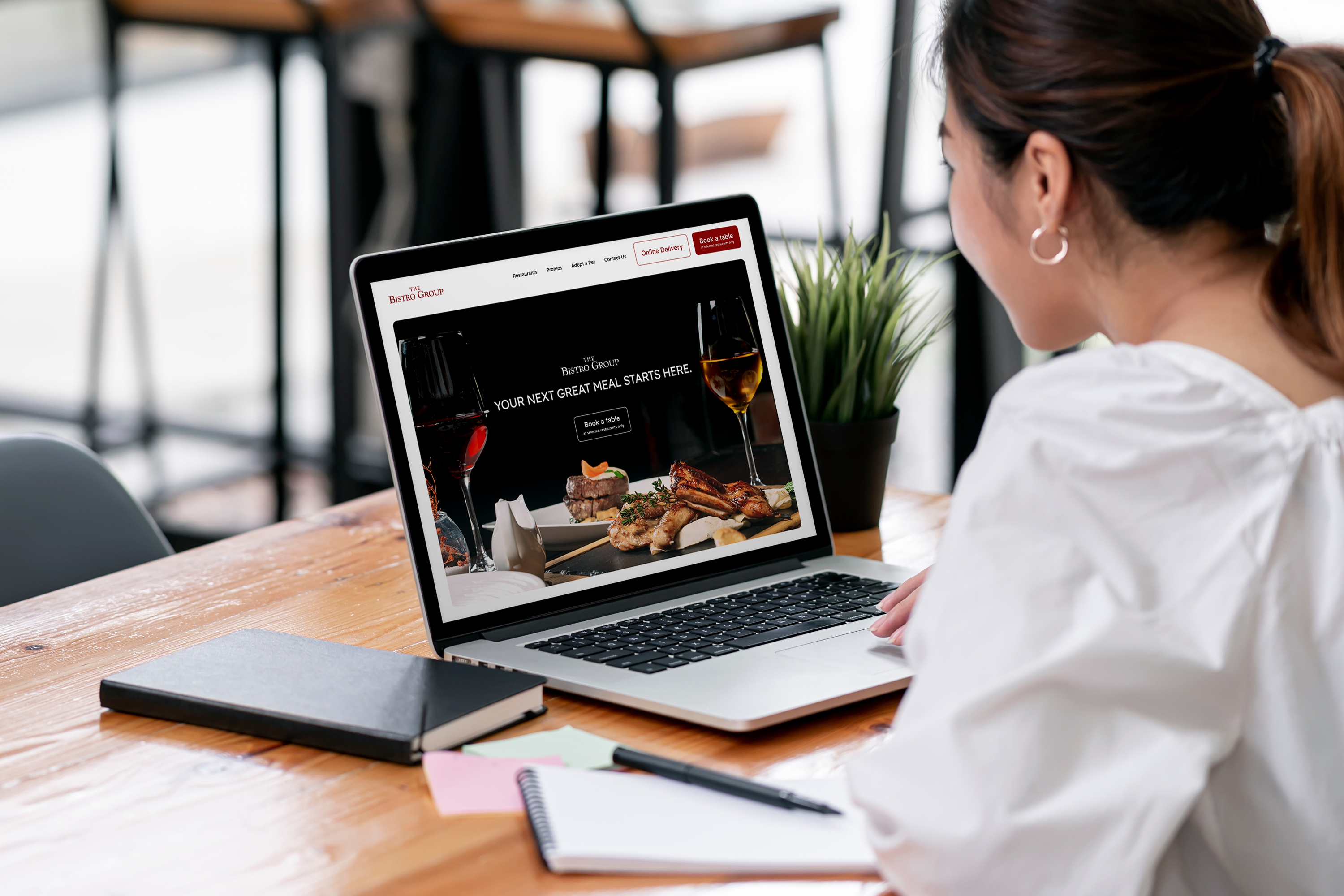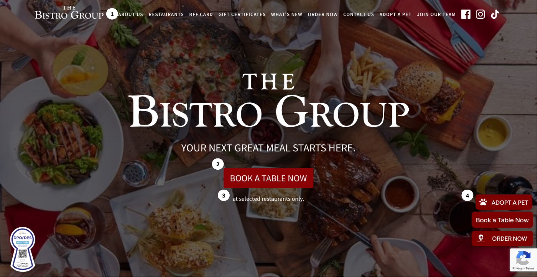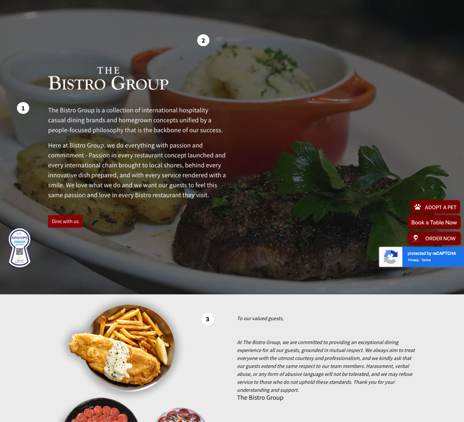 The Bistro Group website is a landing page with multiple links that scrolls down to the specific category. While the site appetites the viewer, the content can be cluttered at times.